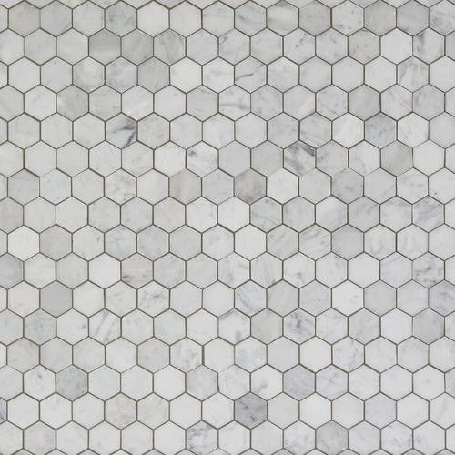 Accent the look of your home with this 12in. x 12in. polished Bianco Carrara Hexagon Marble Mosaic. The white color gives a nice touch to any room.